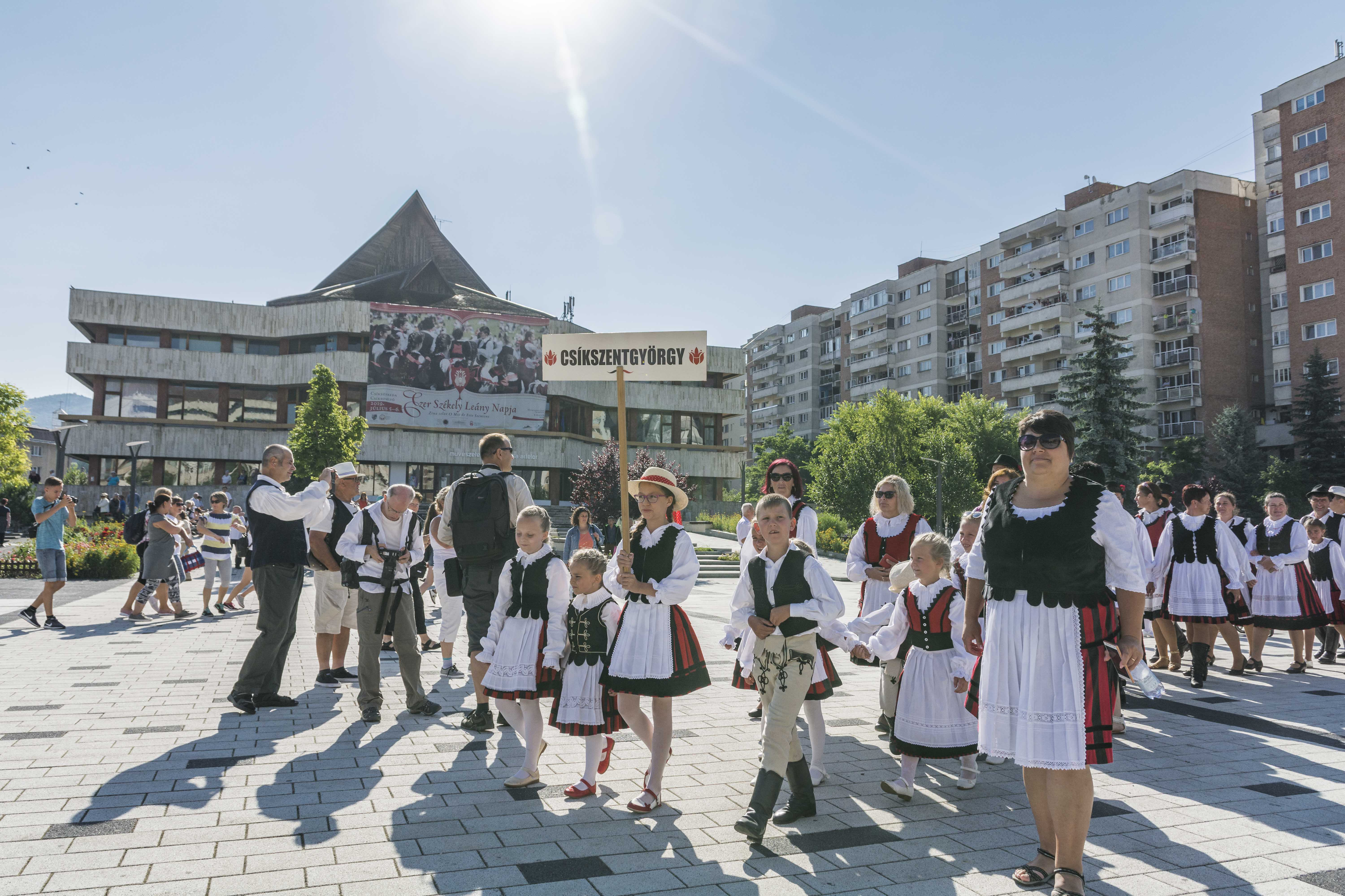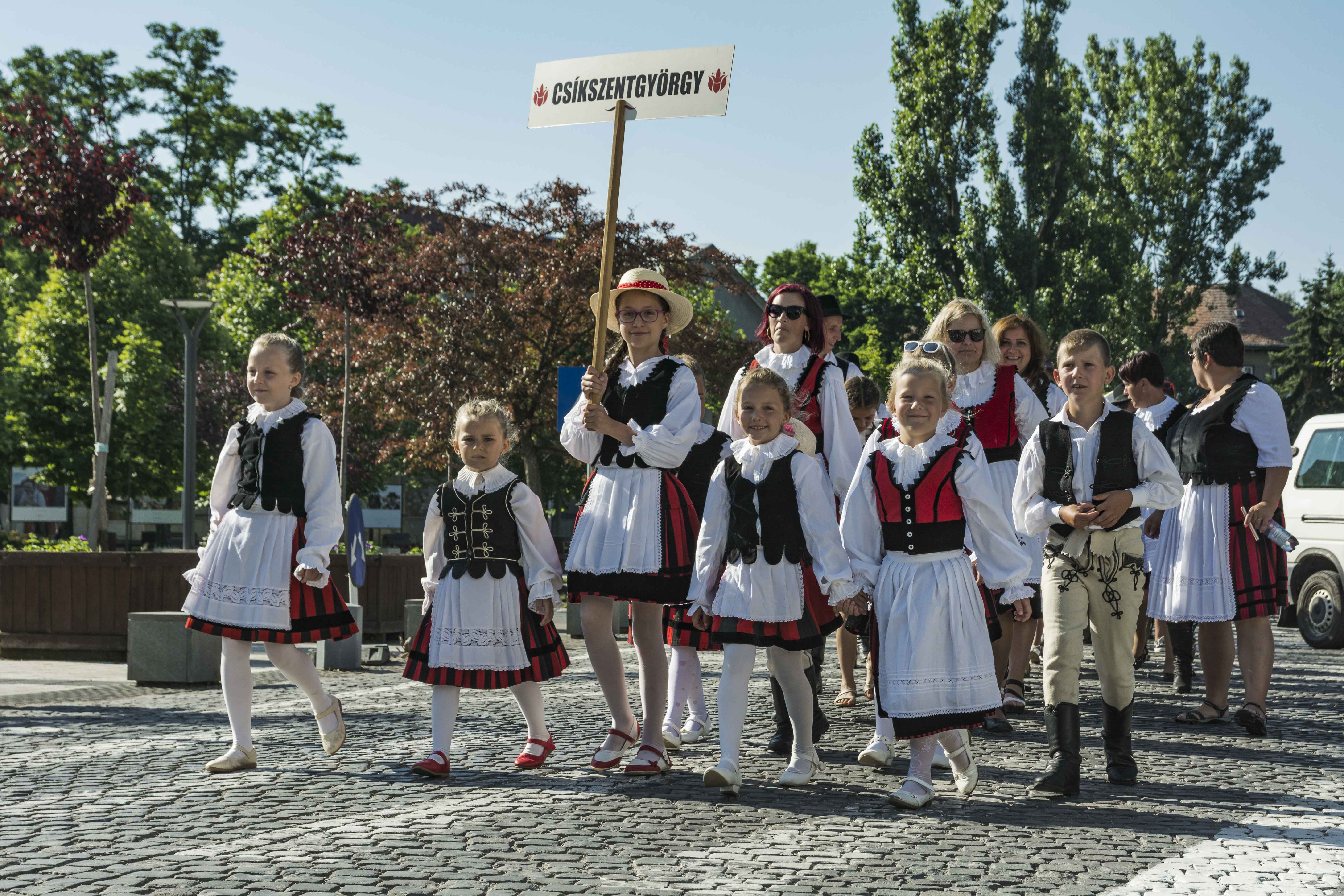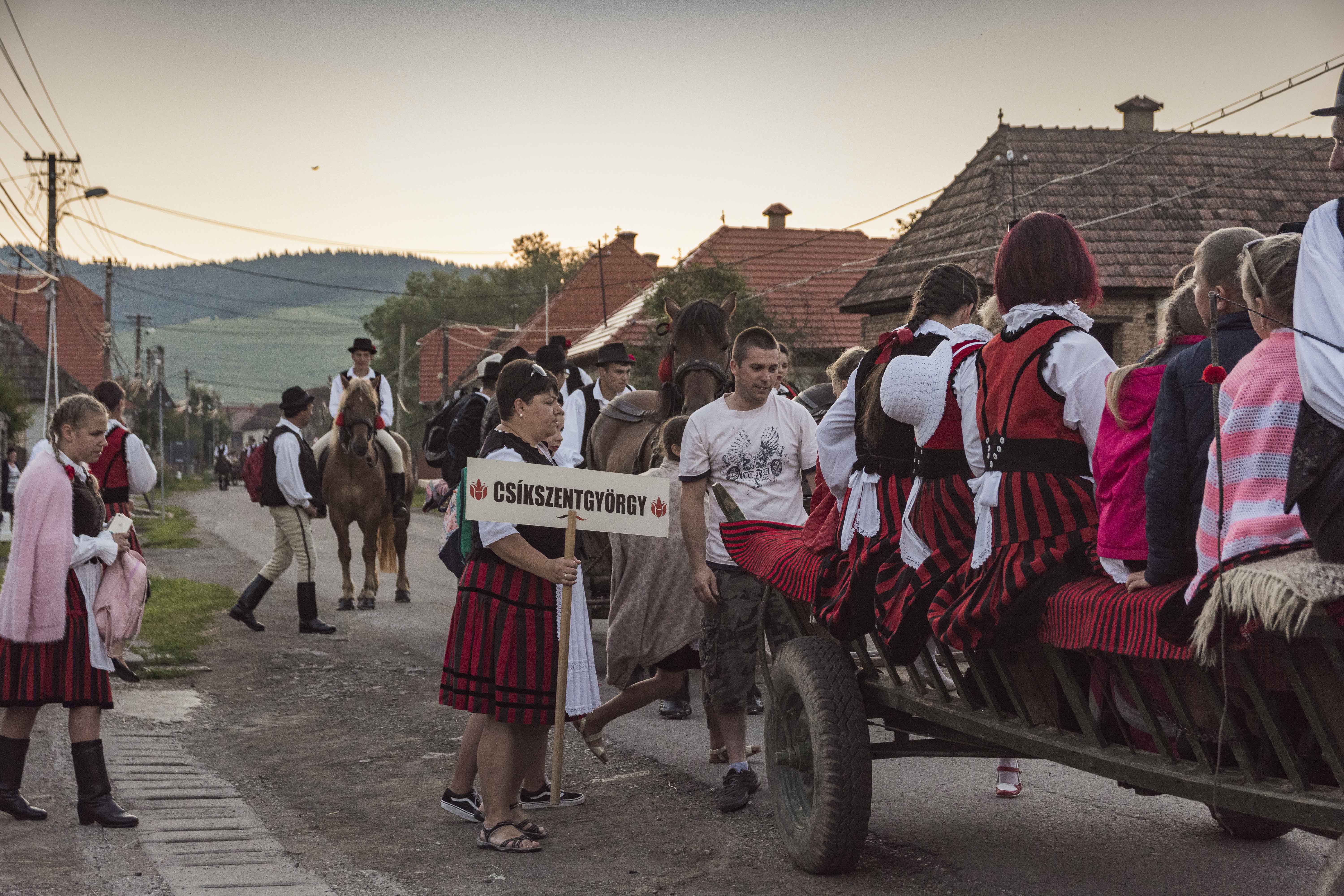One farm wagon left from Pottyond, then more joined from the other five villages of the municipality -Csíkménaság/Armășeni, Ménaságújfalu/Armășenii Noi, Csíkszentgyörgy/Ciucsângeorgiu Csíkbánkfalva/Bancu, Kotormány/Cotormani -, the group expanded to 165 people when at half past eight they arrived to the entry of Csíkszereda. Hungarian Hussars were waiting for them there, and led the caravan to the main square of the town, where the first part of the event took place. Later the caravan went further to the Csíksomlyó/Șumuleu Ciuc saddle, where further adults, and smaller children from the municipality -coming by bus and by cars- joined them. So our group had most probably more than 250 people altogether.