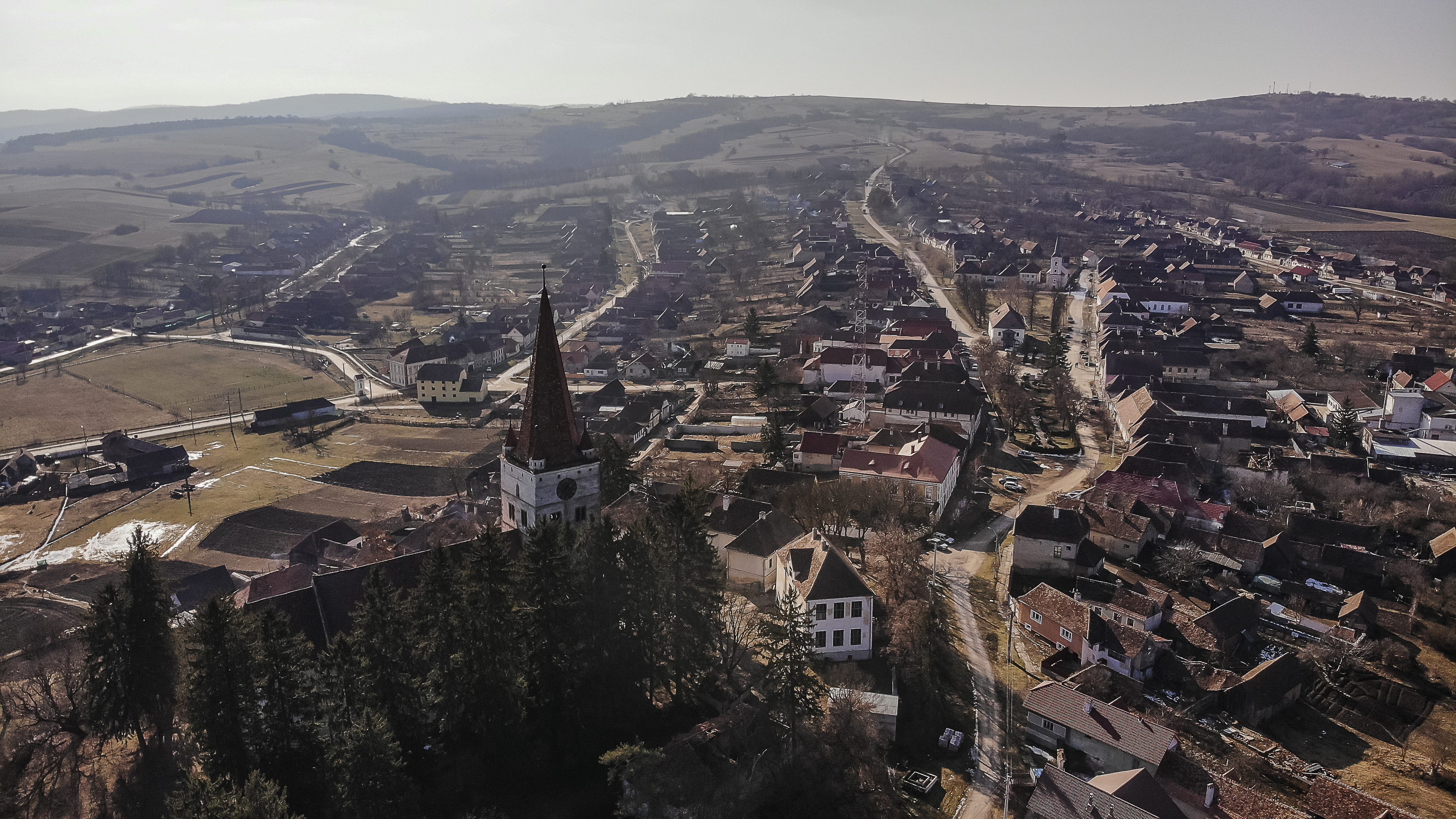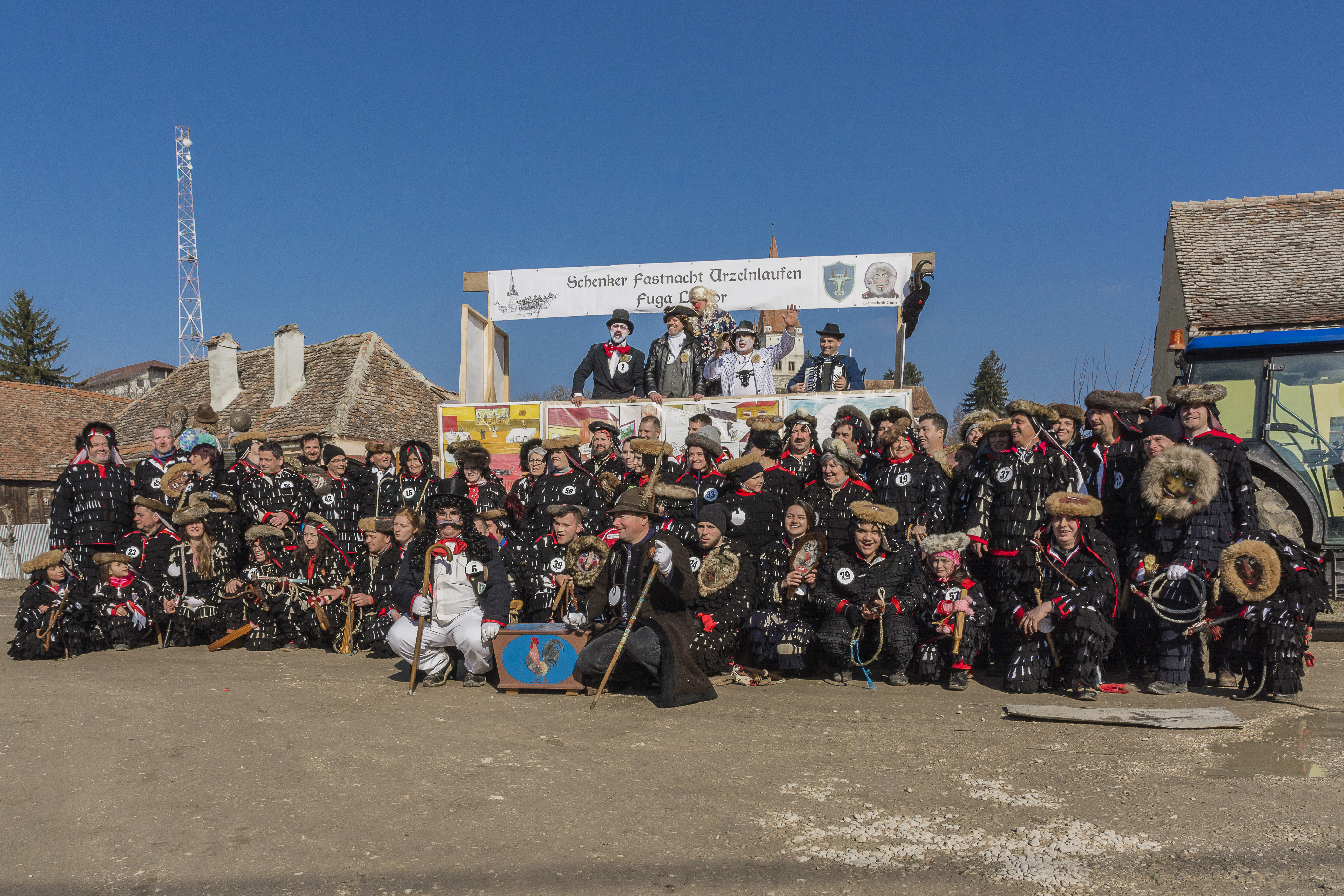 Aerial view of Nagysink. The story behind the carnival custom of the Urzelnlaufen, translated to Romanian as “fuga lolelor”, the run of the lole, is said to be based on a legend that is several centuries old. This legend and the ritual actually relate to the town of Szentágota, but it is practiced in Nagysink as well. It is said, that when Turkish invaders sieged Szentágota, a young girl named Ursula disguised herself in a scary costume, went out of the burg and produced scary noises with her whip, thus chasing away the scared Turks.