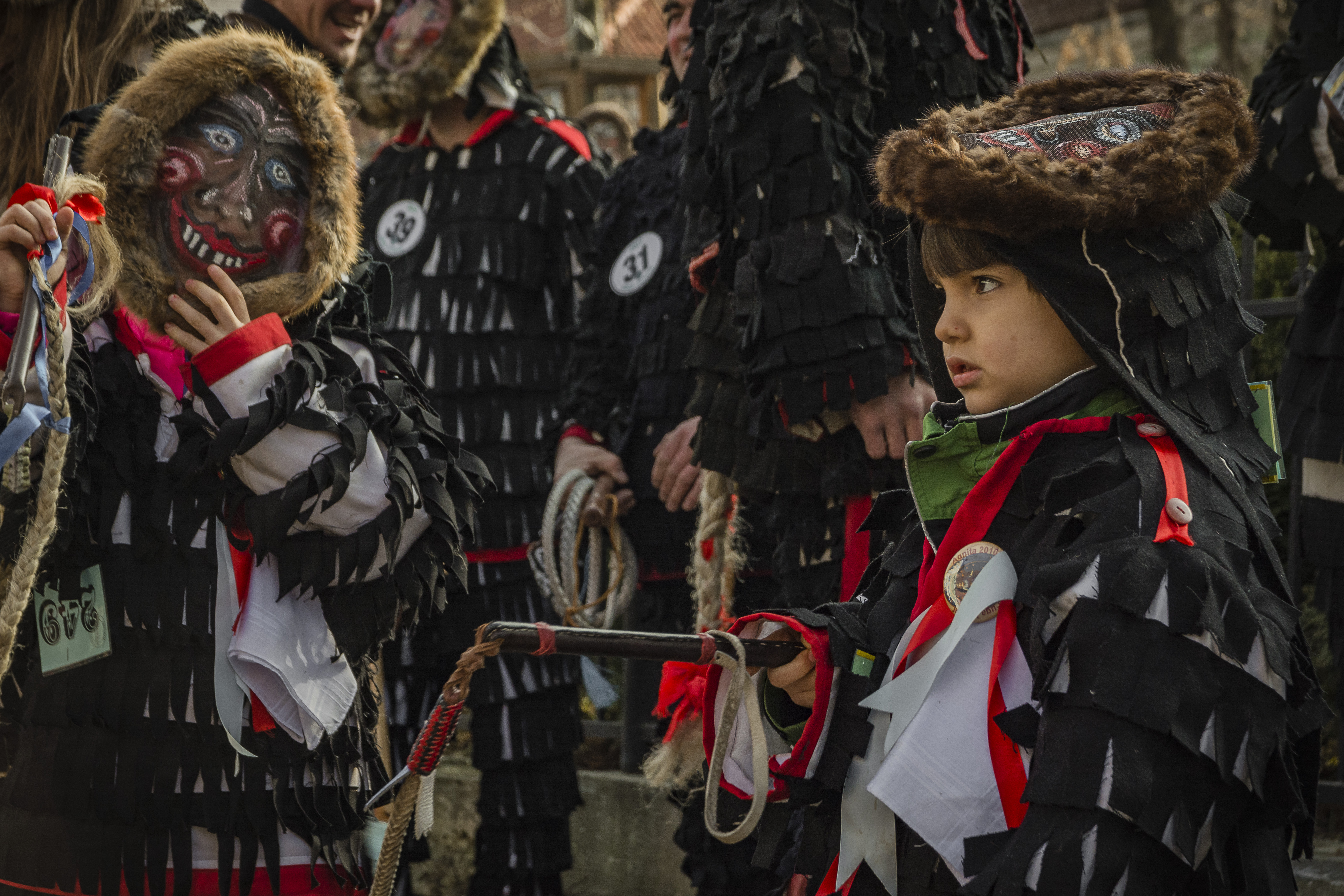 The costume is sewn out of black fabric cords in transversal lines, and the white fabric under it reveals as the Urzeln moves. The painted mask covers the whole face, on the sides it is covered with fur. A scarf with black tassels covers part of his back, and it ends with a hemp-knitted braid decorated with colored bands. Around his waist he wears a wide belt which has one or two large bells attached to it, and the leather whip is an important element as well.