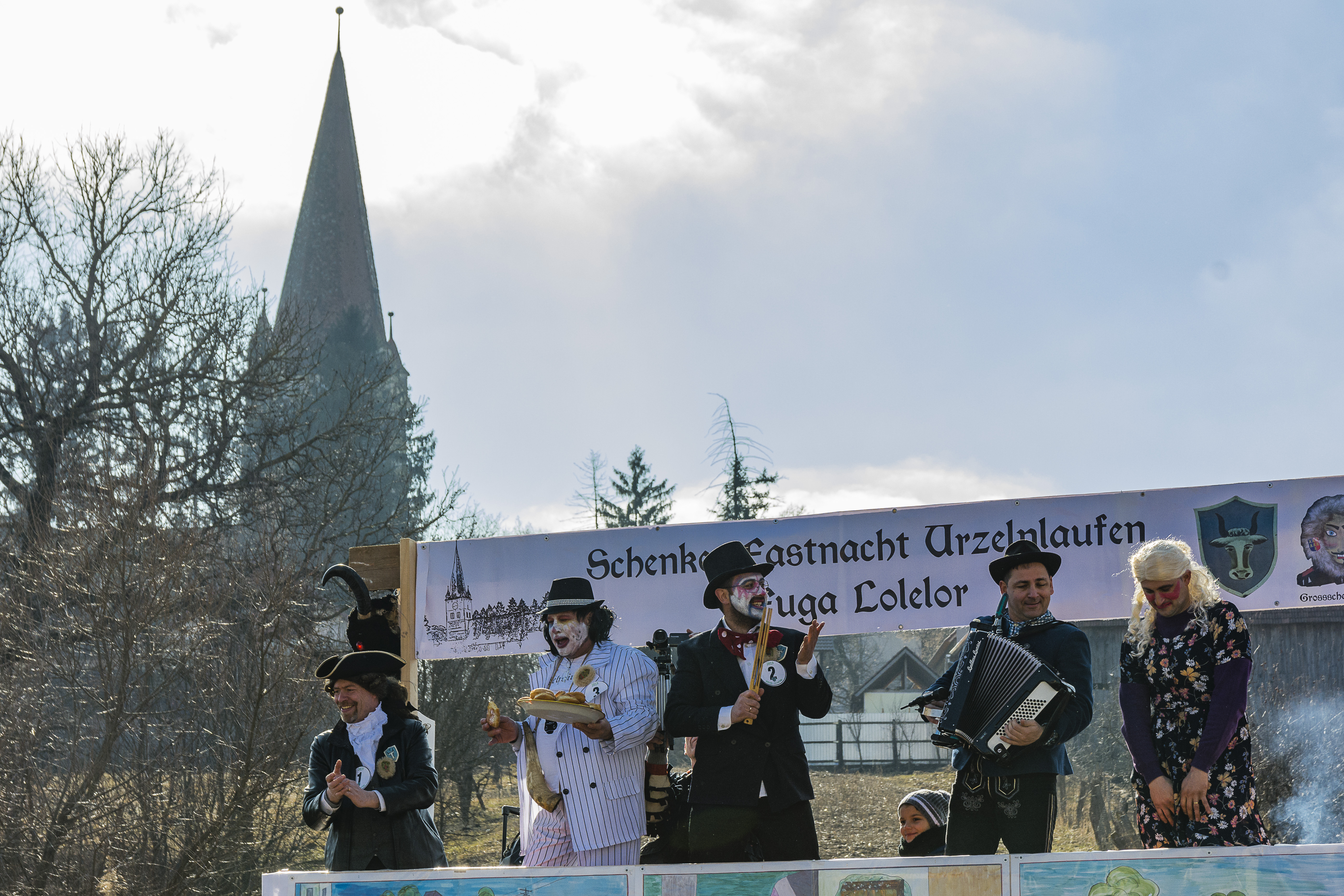The carnival procession ends with the Urzeln running in groups on the streets to chase away everything that is evil. They are lashing their whips and rattling their cowbells to scare winter and darkness.