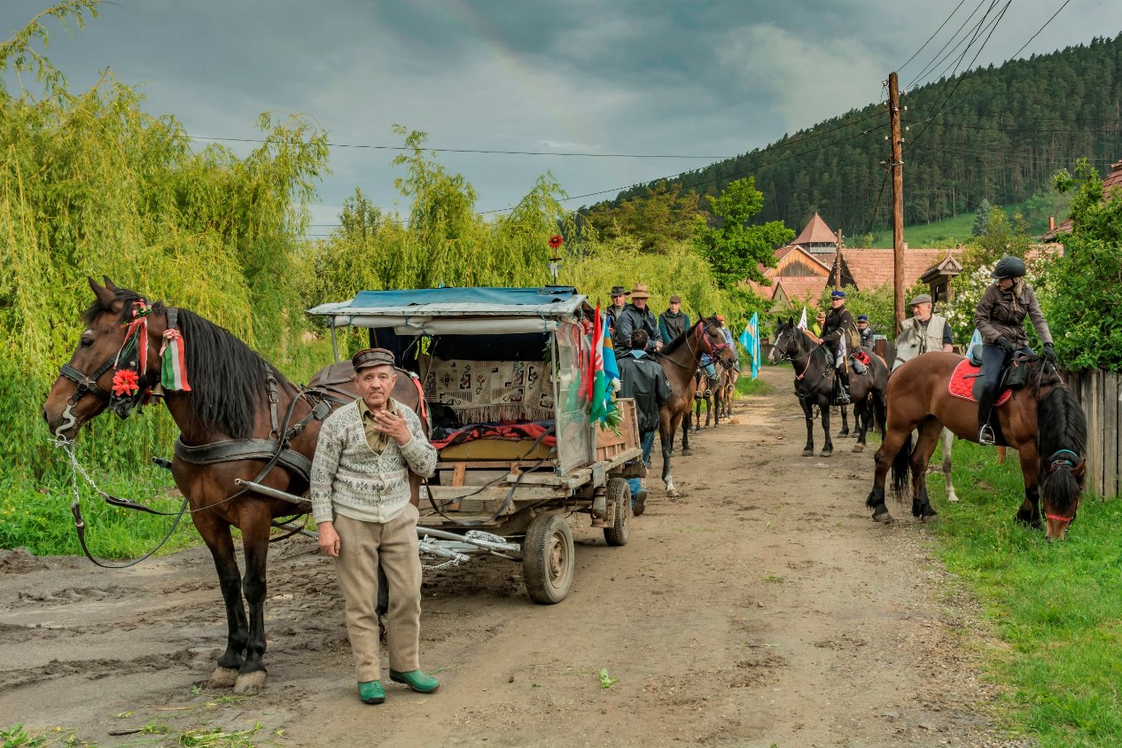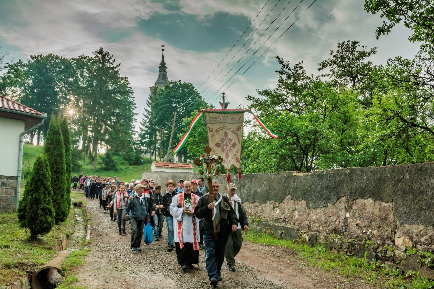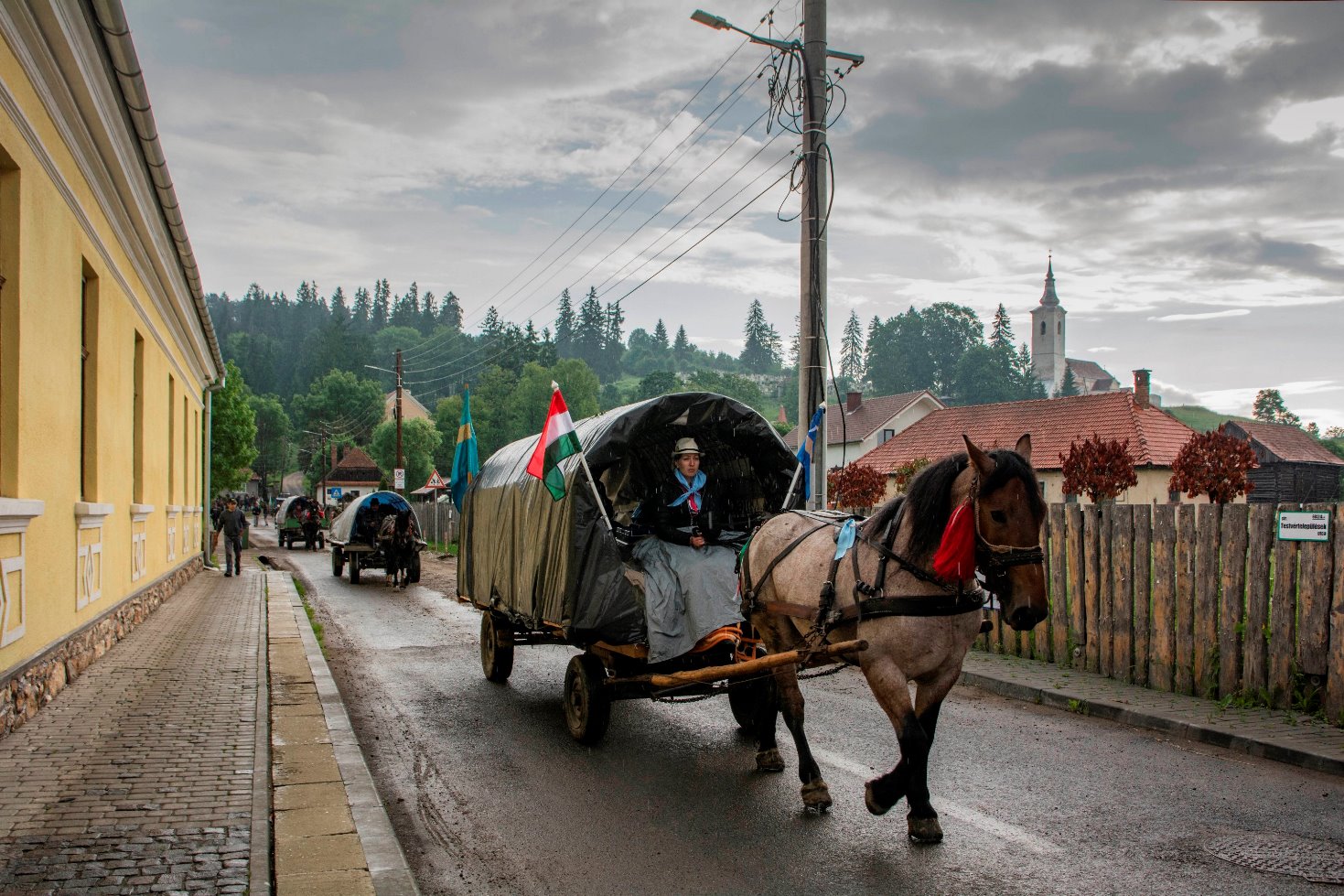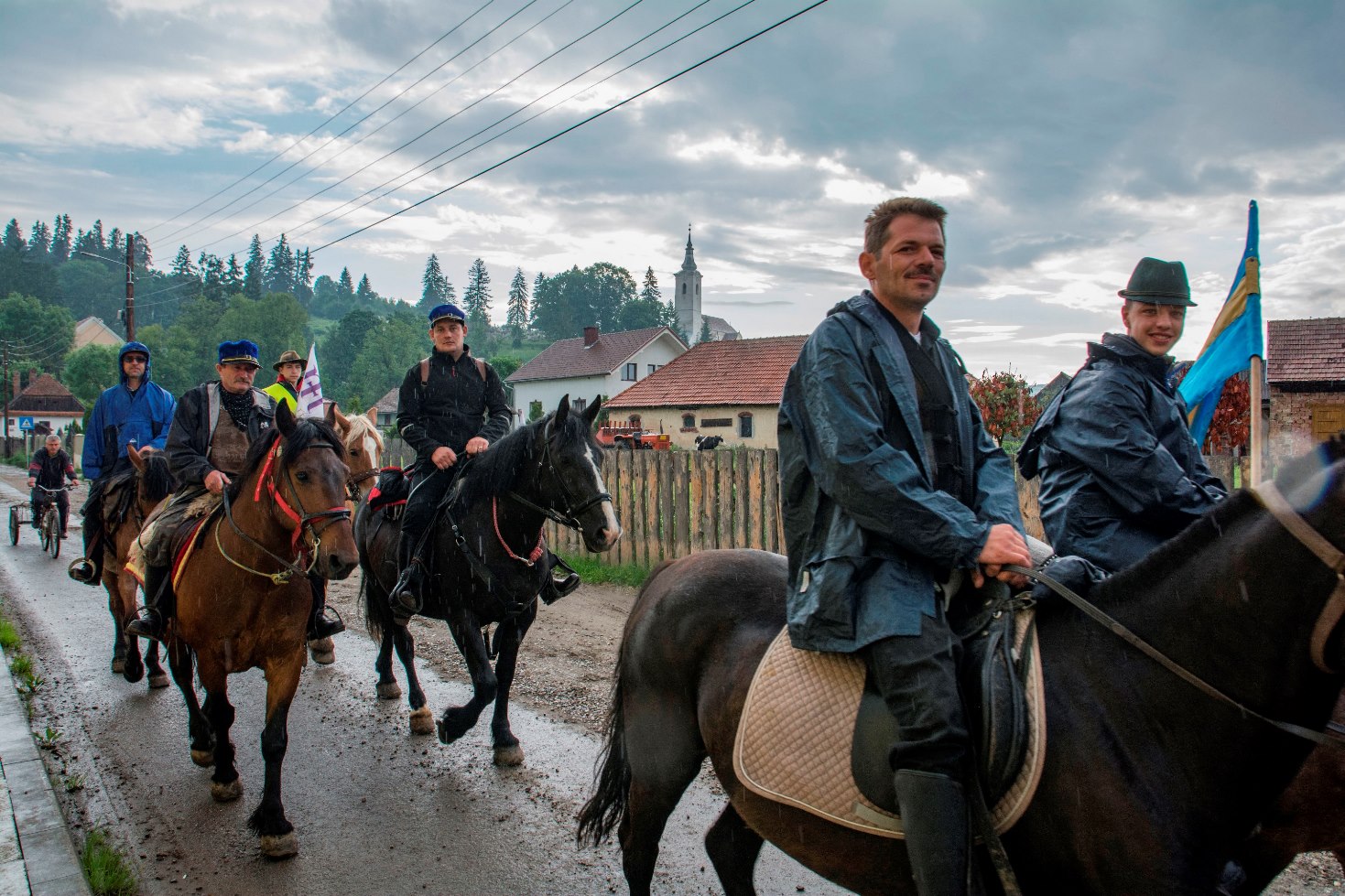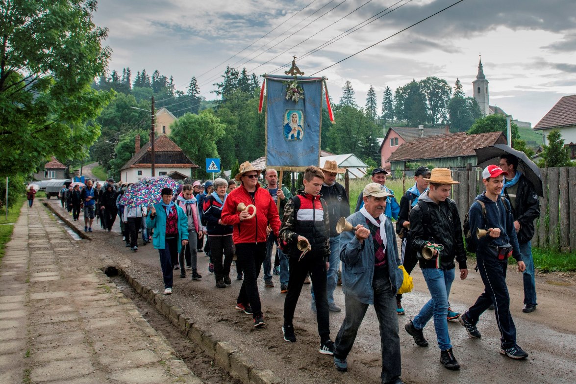 At 6:30 a.m. the Mass starts at Gyergyószárhegy/Lazarea in honor of their pilgrims. By 7:00 a.m. roughly 60–70 people are ready for their two-day long journey. In the pouring rain pedestrian pilgrims are followed by horse-drawn carriages – transporting their luggage – and also some other pilgrims from Gyergyóremete/Remetea who joined them on horses.