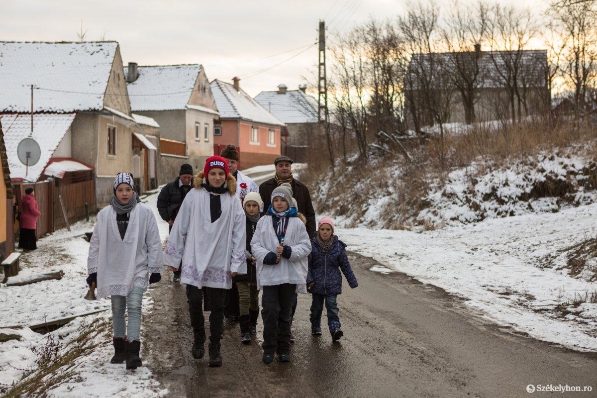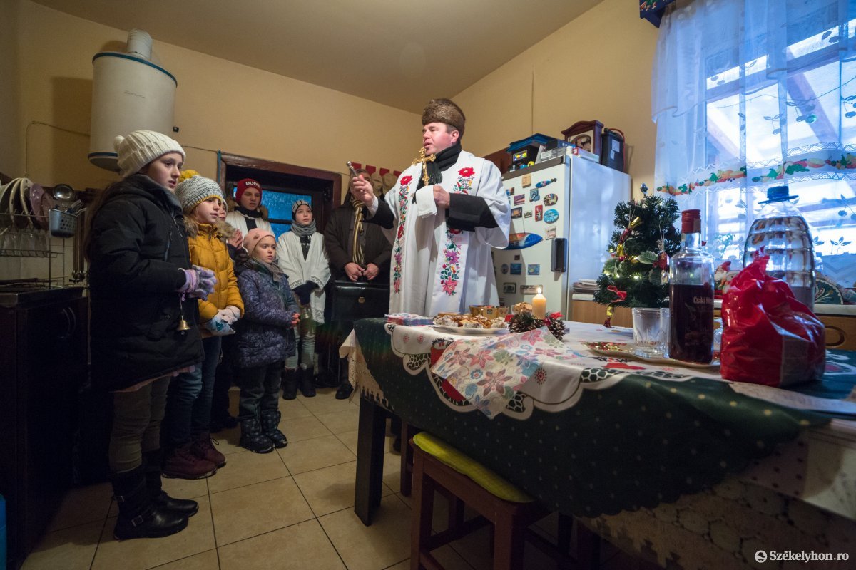 In years when weather conditions allow, the priest and his helpers – including little children with small bells – go from house to house on a horse-drawn sleigh. This year, two houses in Gyepes were visited by Father Huba Tamás, Cantor István Székely, helper Ferenc Oláh Jr., and the donation-carrier (called the “saint donkey” by locals) Gyula Molnár.